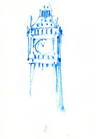 So I focused on the tower and tried out a few approaches with different tools, Tombow brushpens and watercolour pencils, for a start.